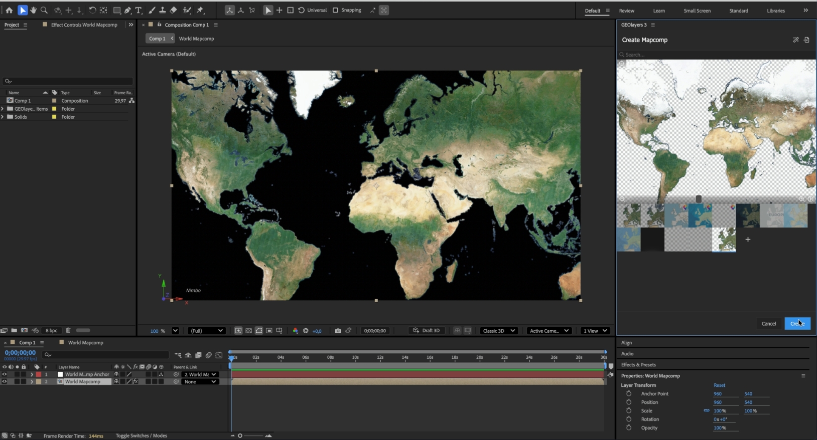 Compatibility with After Effects’ Geolayers plugin and easy integration through TMS / WMTS streams.